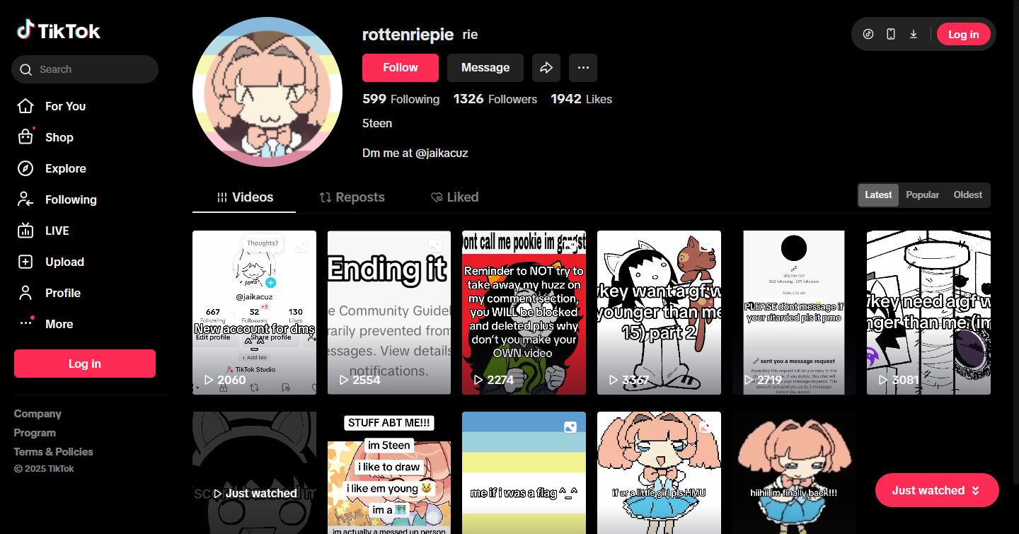 03:50, 4 September 2025 | RyeTT1.JPG (file) | 171 KB | Evidence of Ryes Pedo TikTok Screenshot: 1 For future use. | 1 | |