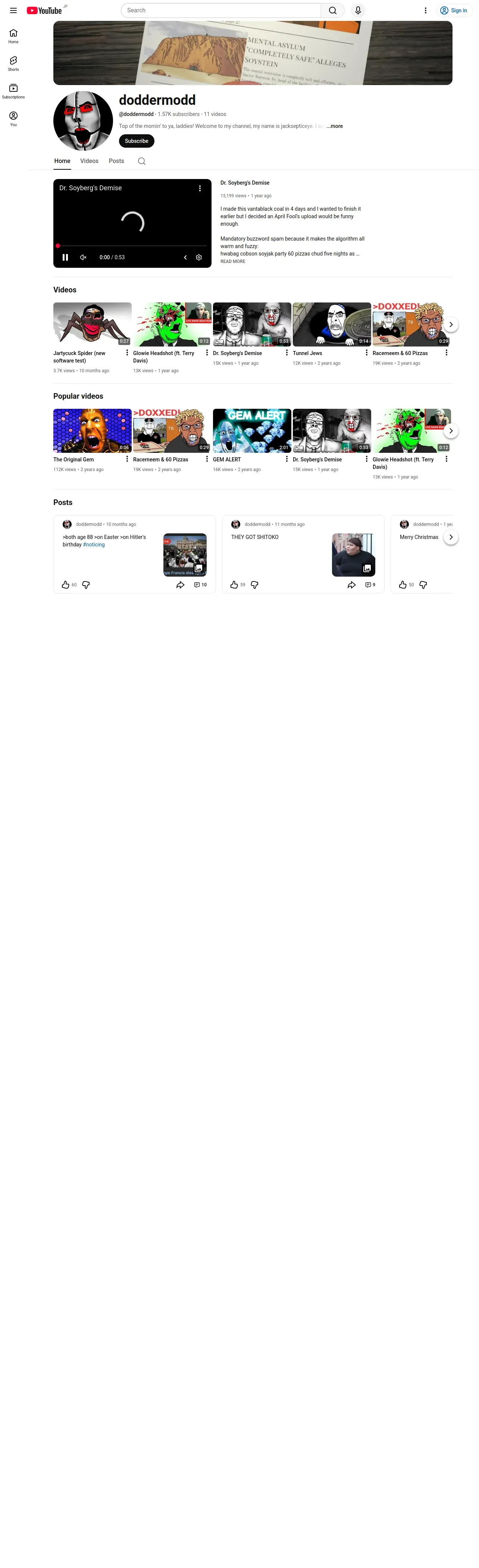 '''Doddermodd''', also known as '''Gemgineer''', is a drawfag, animator, and [[YouTube|Soytuber]] | '''Doddermodd''', alternatively named '''Doddermod''' and also known as '''Gemgineer''', is a drawfag, animator, and [[YouTube|Soytuber]]<ref>https://megalodon.jp/og/2026-0223-2051-10/https://youtube.com:443/channel/UCPnyWrGRZjSDwZxwm_TCPmg</ref>. He was also a Shemmy janny and former admin alongside [[Vadim]], as well as a minor member of Froot's cabal back in 2024. Unfortunately, he was banned from the inner Soysphere for his participation on the Shemmy when it was active. | ||