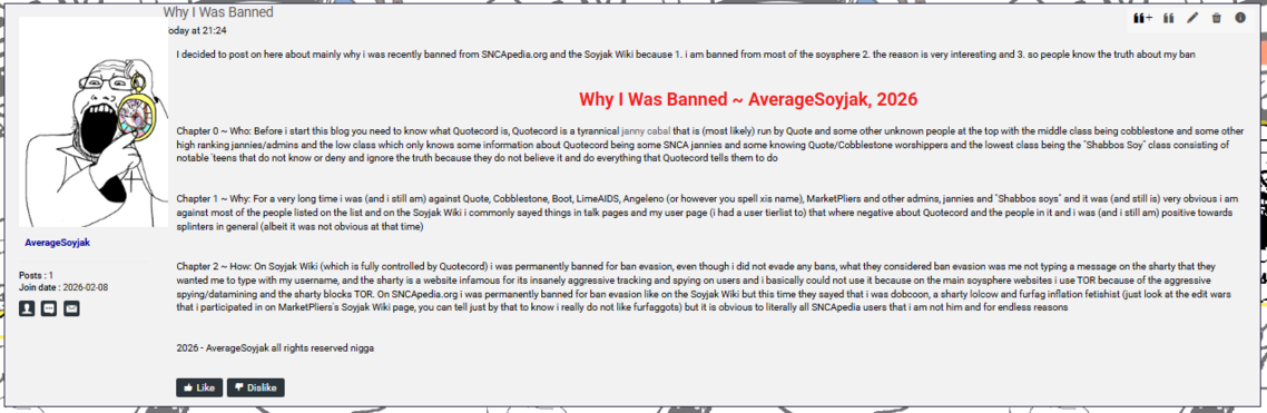 [[File:Erghrthrh.png|thumb|1138x1138px|AverageSoyjak explains why he was banned from the big ki' and here.]] | |||
