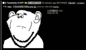 Revision as of 03:52, 26 January 2026 by Coalfarmer (talk | contribs) (Created page with "Saskdeity is a german /pol/ namefag. He is very nice and is against porn in /pol/. Which is keyed. He asked me (coalfarmer) to created this page so he could be notable or something. left|thumb|Saskdeity asking for article {{Infobox person|name=Saskdeity|IAS?=sometimes|known for=Being nice|years active=2025-now|sexuality=Straight|race=White German|religion=Christian|gender=Male|status=Active|baptized=Yes|nationality=German}}")