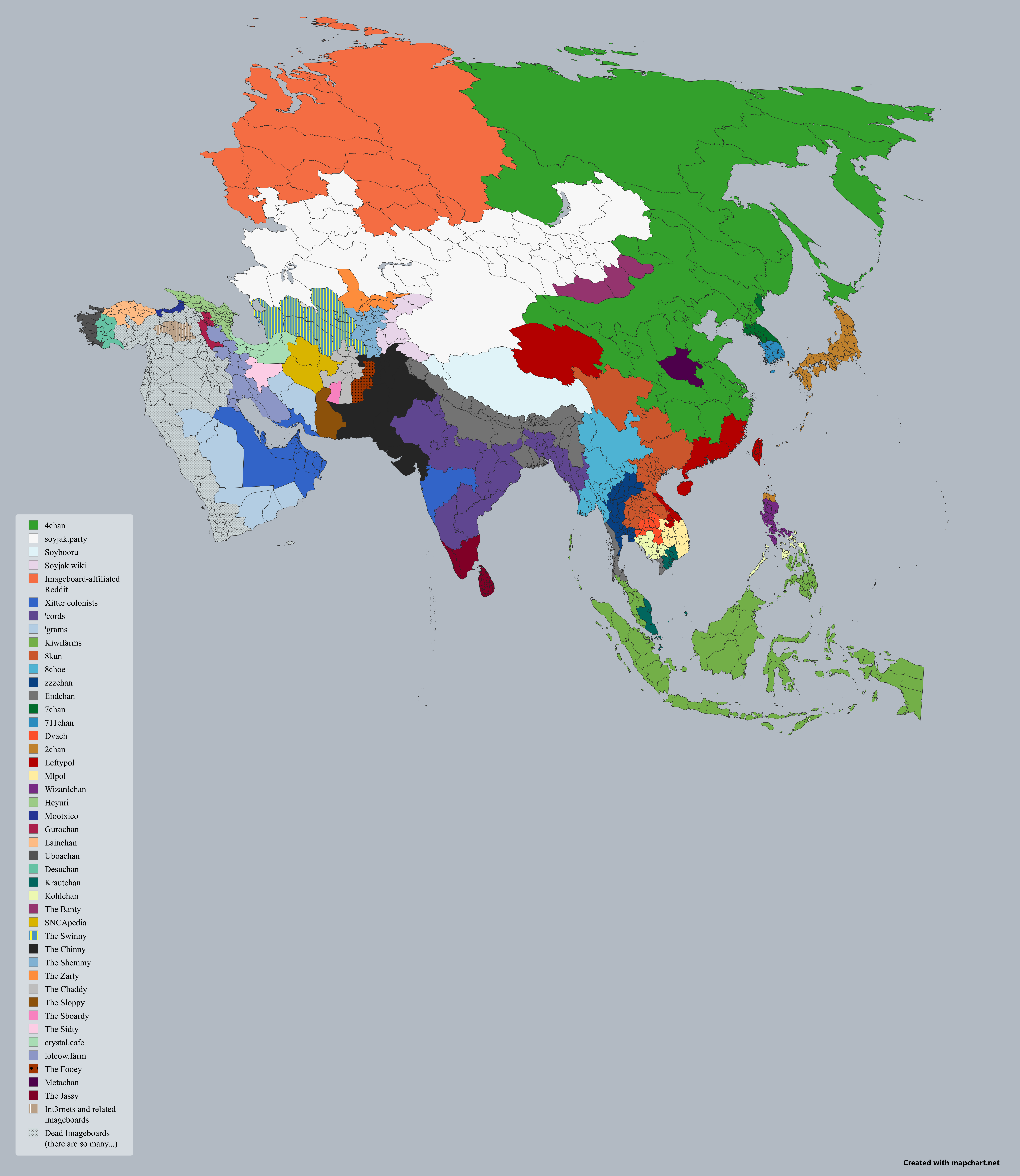 A detailed map of asian provinces where nations are replaced with imageboards and notable tourists.