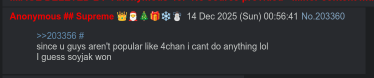 [edit | edit source]Leto was (already) BTFOed by the Sharty's security filters. Image appears to be taken from Metachan; original image from Quote on Sharty IRC #soy (thelounge.soyjak.st).