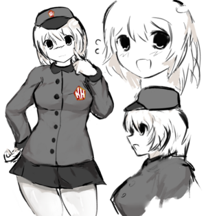 Nedelya (from Russian «неделя», meaning "week") is a concept female mascot for TheKuzzy, created by Shemmysloota sometime during the sites first run. She is named after Kuz's wife most likely. She has white hair, white skin, a green button coat, a cap, and a short skirt (to maximize gooning potential). She also has average sized breasts, which is somewhat rare for Shemmysloota to draw.