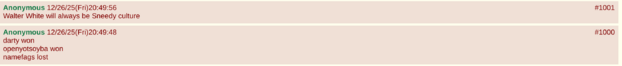 [edit | edit source]The 1500th GET on The Sneedy textboard was stolen by a redditGOD, with the message "walter white wabag", i guess this means Walter White is Sneedy culture now[12].