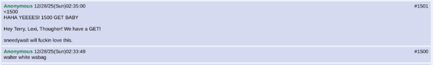 [edit | edit source]On December 25, 2025, On Sneedmas, the textboard had 2 notable and gemmy GETs. One sent a catbox.moe link to the refined version of the sneedteen image with the message