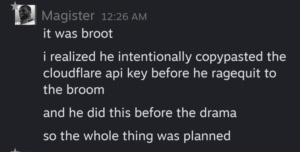 However on March 25, 2026 the site would go down again, displaying a Cuckflare Error 523[11] for half an hour until getting back up, albeit going back down a couple more hours later, redirecting to the Shrooru, with it being revealed that a certain tawny individual who likes to larp as a vegetable was actually behind the DDOS, copying the Cuckflare API key. [12]