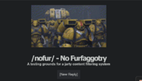 /nofur/ - No furfaggotry was a testing ground board on the Jarty made by Lute in September of 2023 and then shut down in November of 2023 , the whole purpose of the board was for testing purposes, more specifically to test anti-CSAM spam measures, something which Lute was praised for.