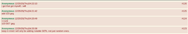 [edit | edit source]The 123th GET on the textboard site was me letting everyone know that i would only be adding notable GETs[11].