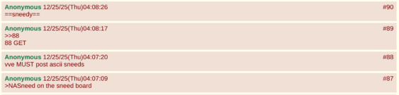 [edit | edit source]The 88th and 90th GETs on the textboard version on the site were "vve MUST post ascii sneeds" and ==sneedy==[10]