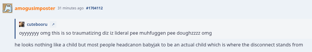 In a babyjak 'p post in the 'ru, They claim babyjak isn't real and people who say it's 'p are thinking otherwise. This sounded eerily similar to lolicon gooners defending their material with "they are not real children!". [Clarification needed] (talk) 21:47, 12 March 2026 (UTC)