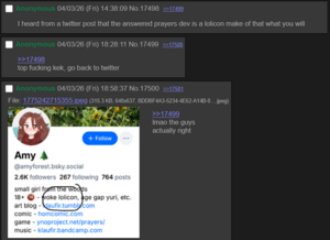 - The 'cord shutdown: on April 2nd, 2026, some acquaintance of seagal (admin) asked him to axe the official 'cord server because it was killing Uboachan's activity and because, surprise, surprise, it attracted many degenerates. Eventually, a middle ground was reached: Uboachan would no longer link to their 'cord, thus separating the two communities. A thread was made regarding this on the Swinny around ten days later. In conclusion: if you are a small forum or imageboard, do NOT make your own Discord server! There are only disadvantages awaiting you if you do.